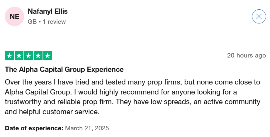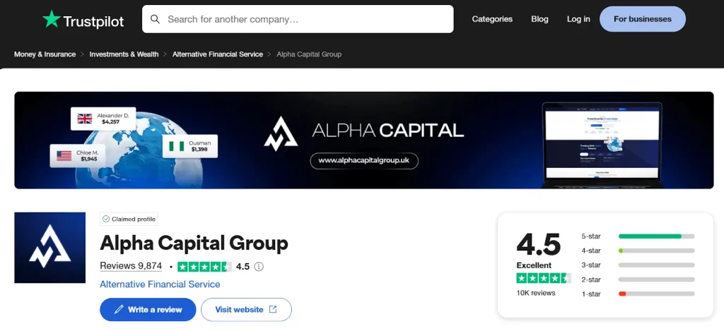 Alpha Capital Group is a verified proprietary trading firm with positive Trustpilot reviews, offering funded accounts since 2020 to traders worldwide (excluding restricted regions).