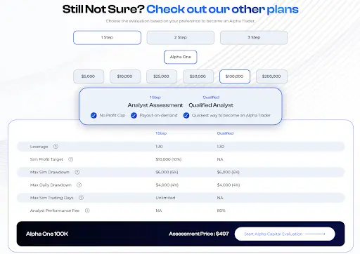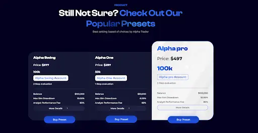 | Funding Options | 2-step evaluation accounts: Alpha Pro and Alpha Swing, with funding up to $200,000 | Evaluation accounts with funding up to $800,000 | Evaluation accounts with funding up to $200,000 |
