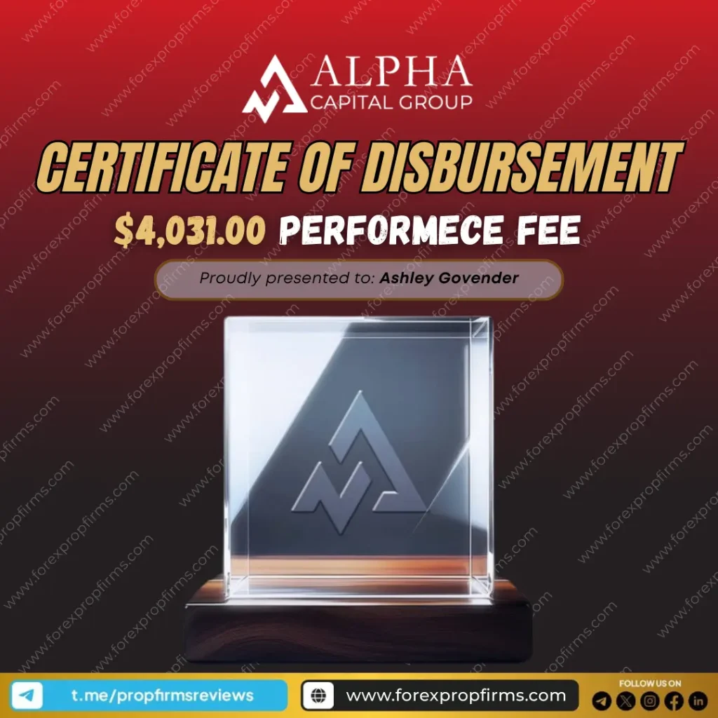 Alpha Capital Group has once again delivered on its commitment to rewarding consistent trading performance. On April 7, 2025, trader Ashley Govender received a verified Alpha Capital Group payout of $4,031, earned through the firm’s funded trader program.