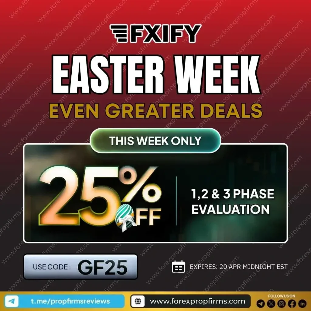 FXIFY is currently running a promotion valid until April 20 at midnight EST, giving traders a 25% discount when using the promo code GF25 at checkout. The offer applies to all FXIFY challenge account models: