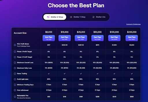 | Stellar Challenge | – Unique evaluation with 8% profit target (Phase 1) and 5% (Phase 2)- 6% overall drawdown and 3% daily- No minimum trading days | – Starts at 85% profit split, can go up to 90%– Account size scales every 4 months by 40%, up to $4 million | Traders aiming for higher initial profit share and a lower risk profile, with a balanced evaluation model |