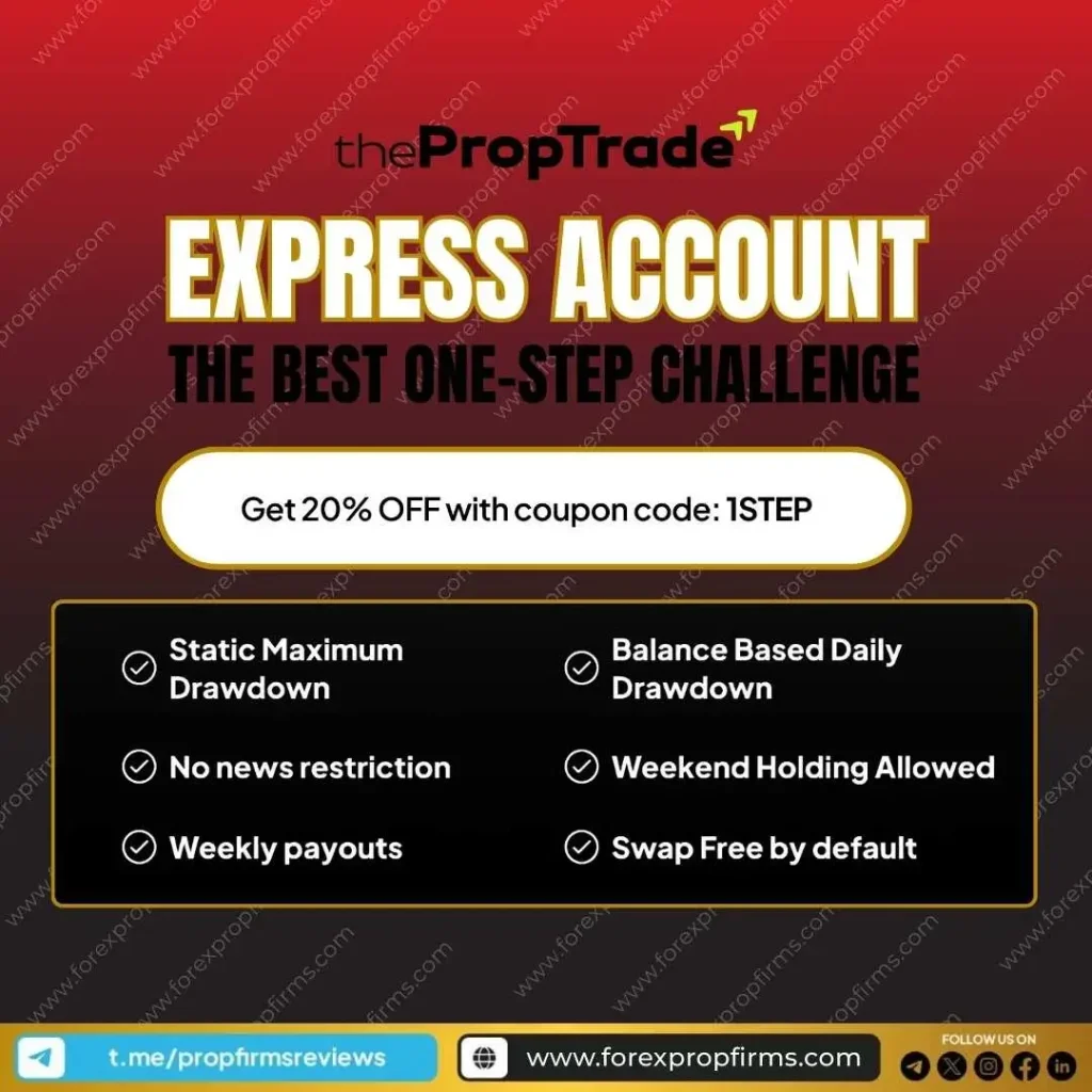 Traders using the Express Account enjoy weekly payout options, giving them quick access to profits. Plus, use the code 1STEP to get a 20% discount when signing up.