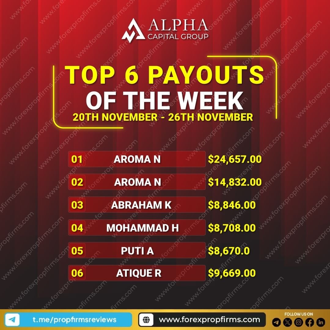 Alpha Capital Group’s recent Power Payouts showcase an impressive display of trading prowess, honoring the outstanding achievements of top performers from November 20th to 26th. This weekly accolade acknowledges the remarkable success of adept traders who continue to demonstrate their expertise in navigating the financial markets.