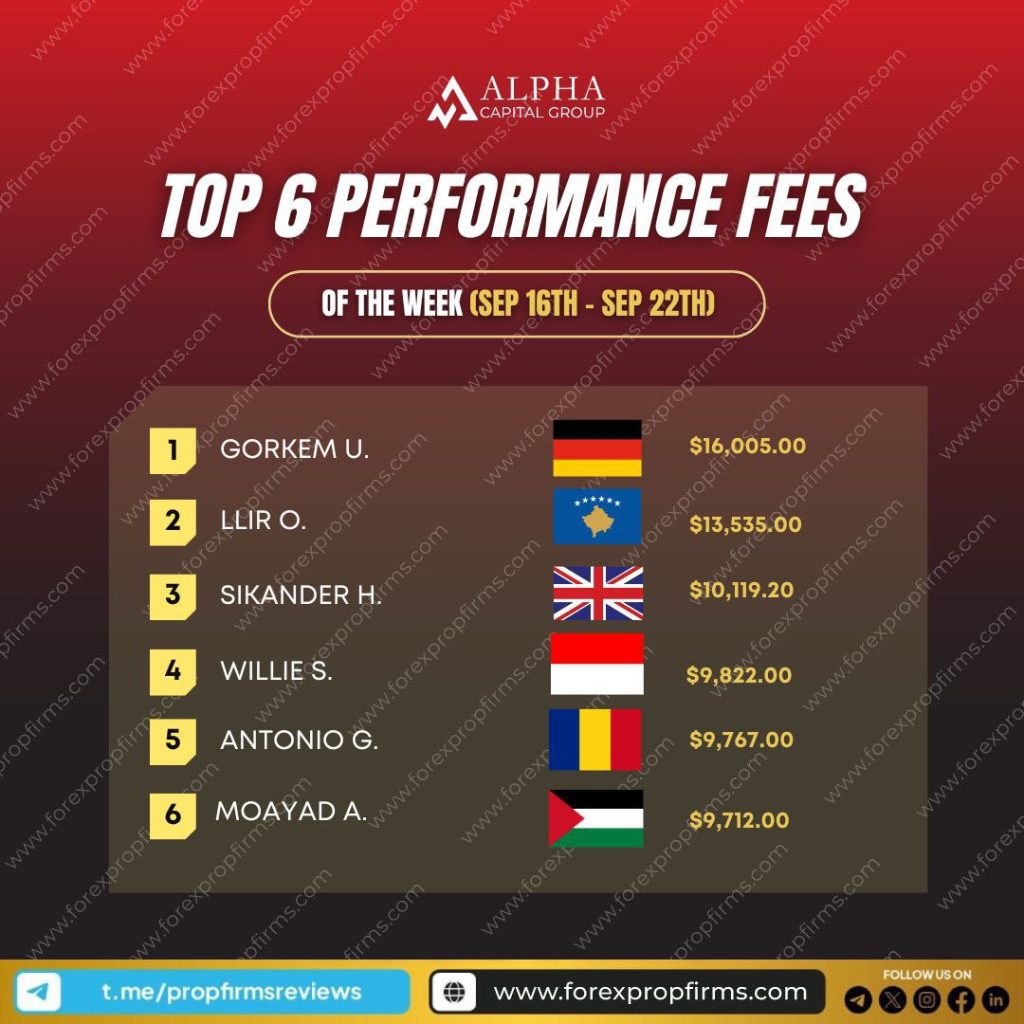 Alpha Capital Group has announced its top traders of the week, showcasing impressive performance fees earned between September 16th and 22nd. Leading the list is Gorkem U., who claimed an impressive $16,005, followed by Llir O. with $13,535. Sikander H. rounds out the top three with $10,119, demonstrating strong trading skills throughout the week. Other notable names include Willie S. ($9,822), Antonio G. ($9,767), and Moayad A. ($9,712), each reflecting consistent success in the market.
