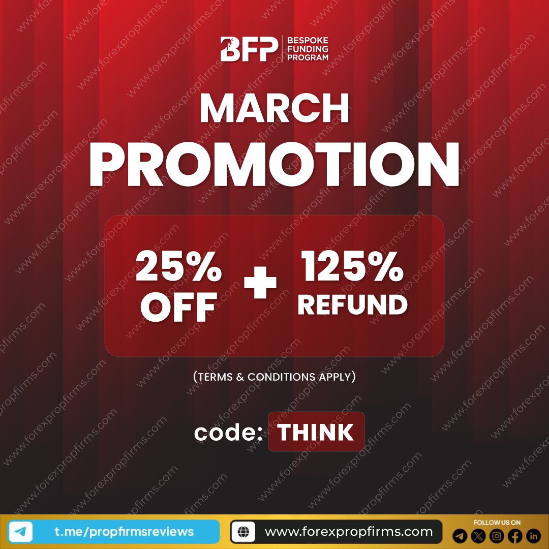 In a limited-time offer, the Bespoke Funding Program presents an enticing March Promotion, inviting traders to unlock exclusive benefits. Enjoy a 20% discount and a generous 25% refund by using the code “THINK.” This unique opportunity allows traders to elevate their financial journey with added flexibility and savings.