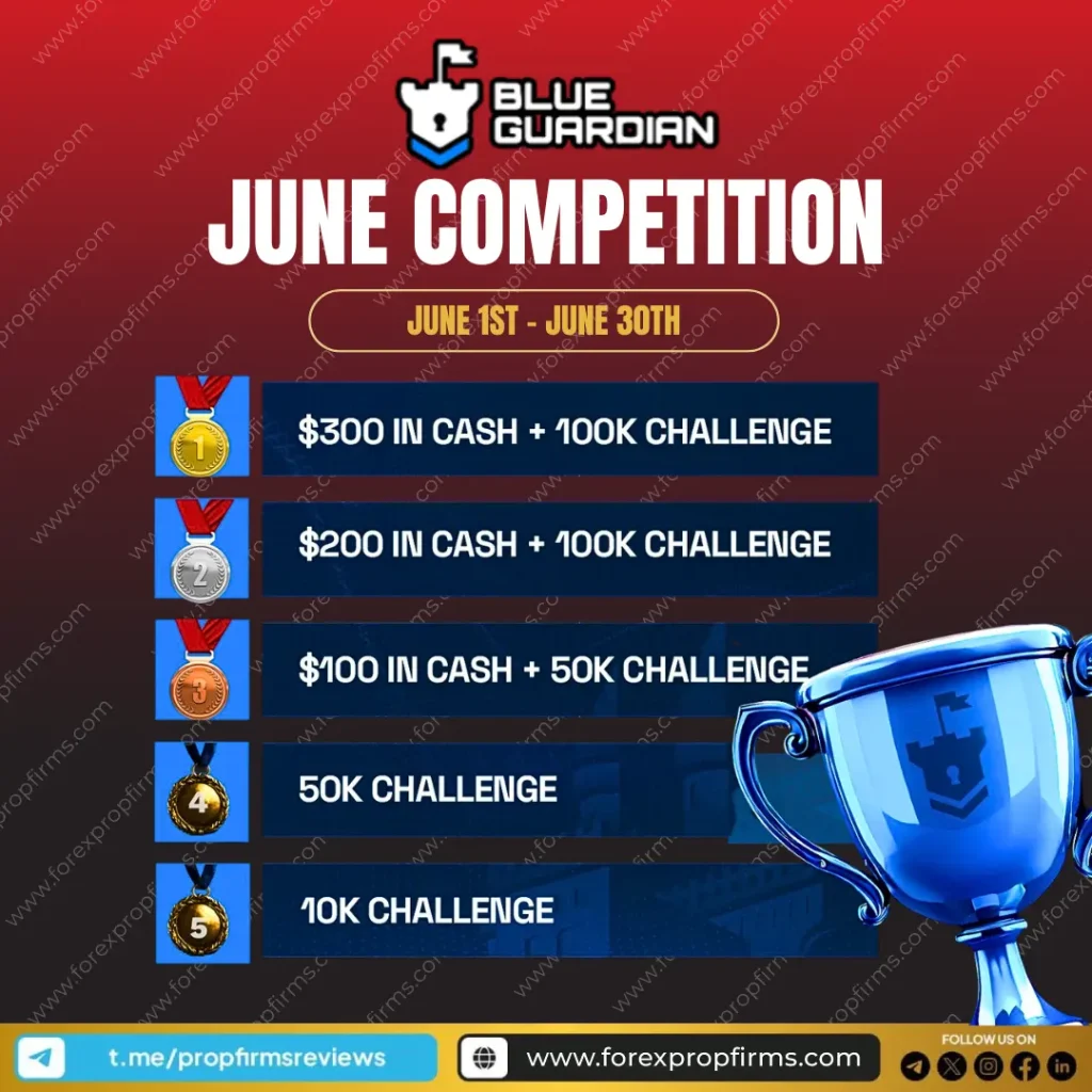Running from June 1st to June 30th, the Blue Guardian $550K free trading challenge welcomes traders of all levels to compete with no entry fee. What’s at stake? A total prize pool of $550,000, including $50,000 in real cash and over $500,000 worth of funded trading accounts.