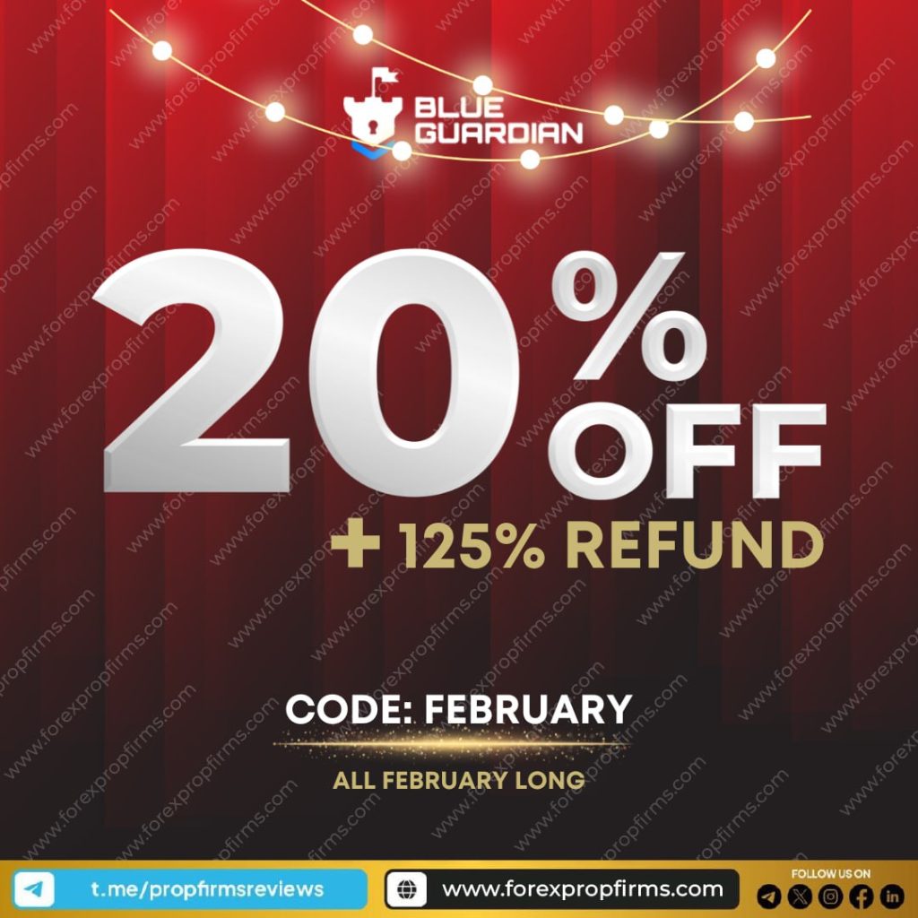Discover unprecedented savings with Blue Guardian throughout February! Benefit from an impressive 20% discount and a remarkable 125% refund, using the code ‘FEBRUARY’. This exclusive offer is crafted to enhance your trading experience and maximize savings.