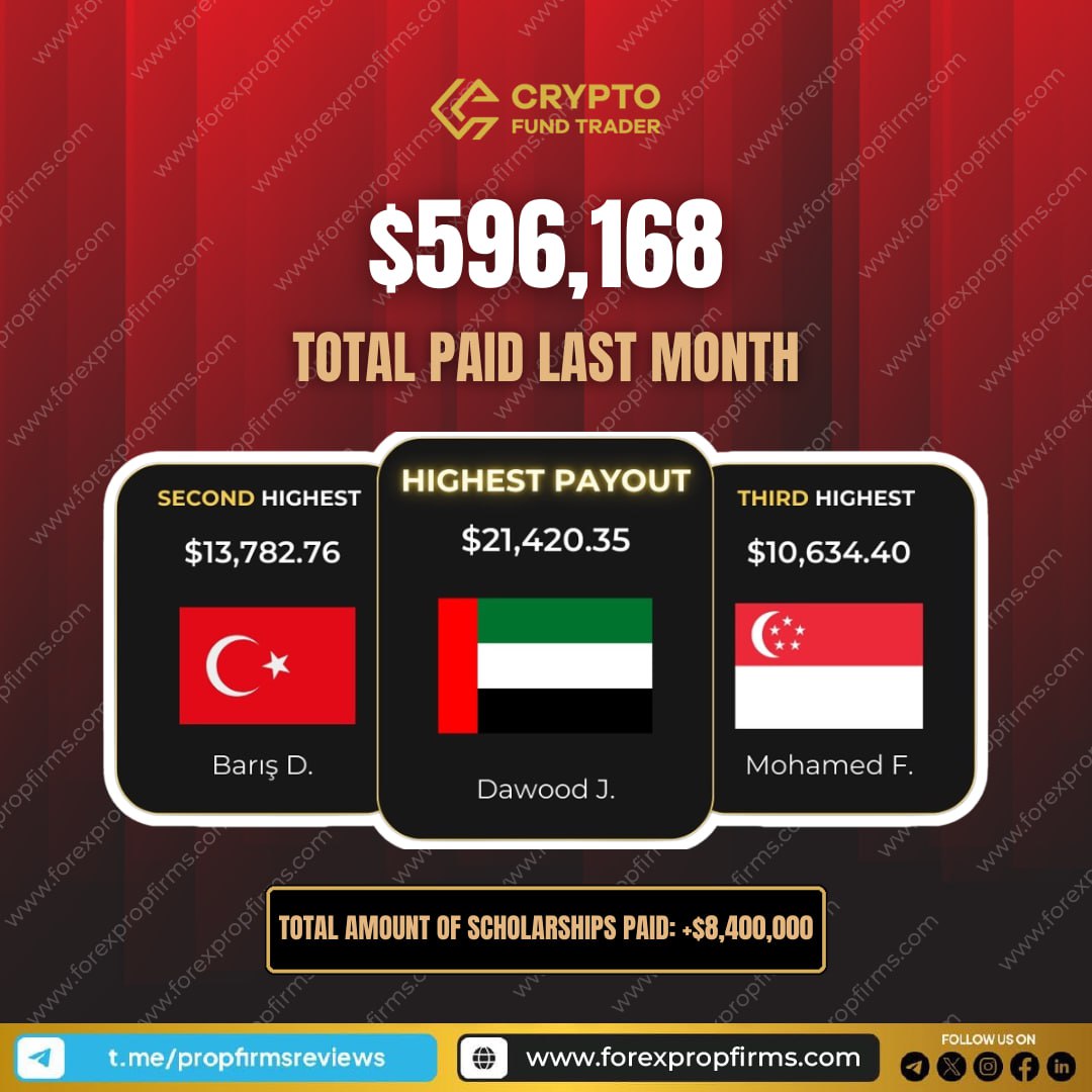 Crypto Fund Trader has made remarkable progress, particularly in its scholarship distribution, which reached $596,168 last month alone. This figure adds to the impressive $8,400,000 total awarded to traders so far. These consistent payouts highlight Crypto Fund Traderβs dedication to fostering opportunities within the crypto trading landscape. By supporting traders financially, the initiative ensures participants can focus on honing their skills and achieving greater success in the fast-paced crypto markets.