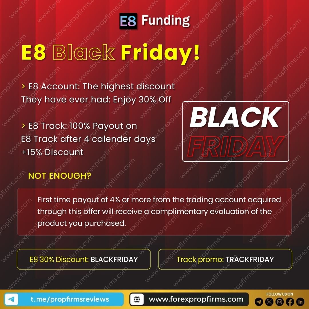 To seize these unbeatable offers, make sure to utilize the provided codes: BLACKFRIDAY for the remarkable 30% discount on the E8 Account, and TRACKFRIDAY to unlock the enticing E8 Track promo.