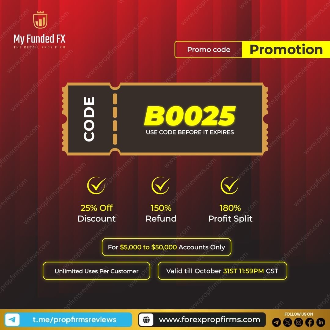 Unveil the potential for enhanced trading experiences this season with Exclusive Offer by My Funded FX using coupon, “BOO25.” Embrace the spirit of the season and leverage this limited-time opportunity to elevate your trading endeavors. The offer delivers an array of enticing advantages including a 25% discount, a remarkable 150% refund provision, and an 80% profit split, amplifying the capacity for profitable trades and minimizing risks.