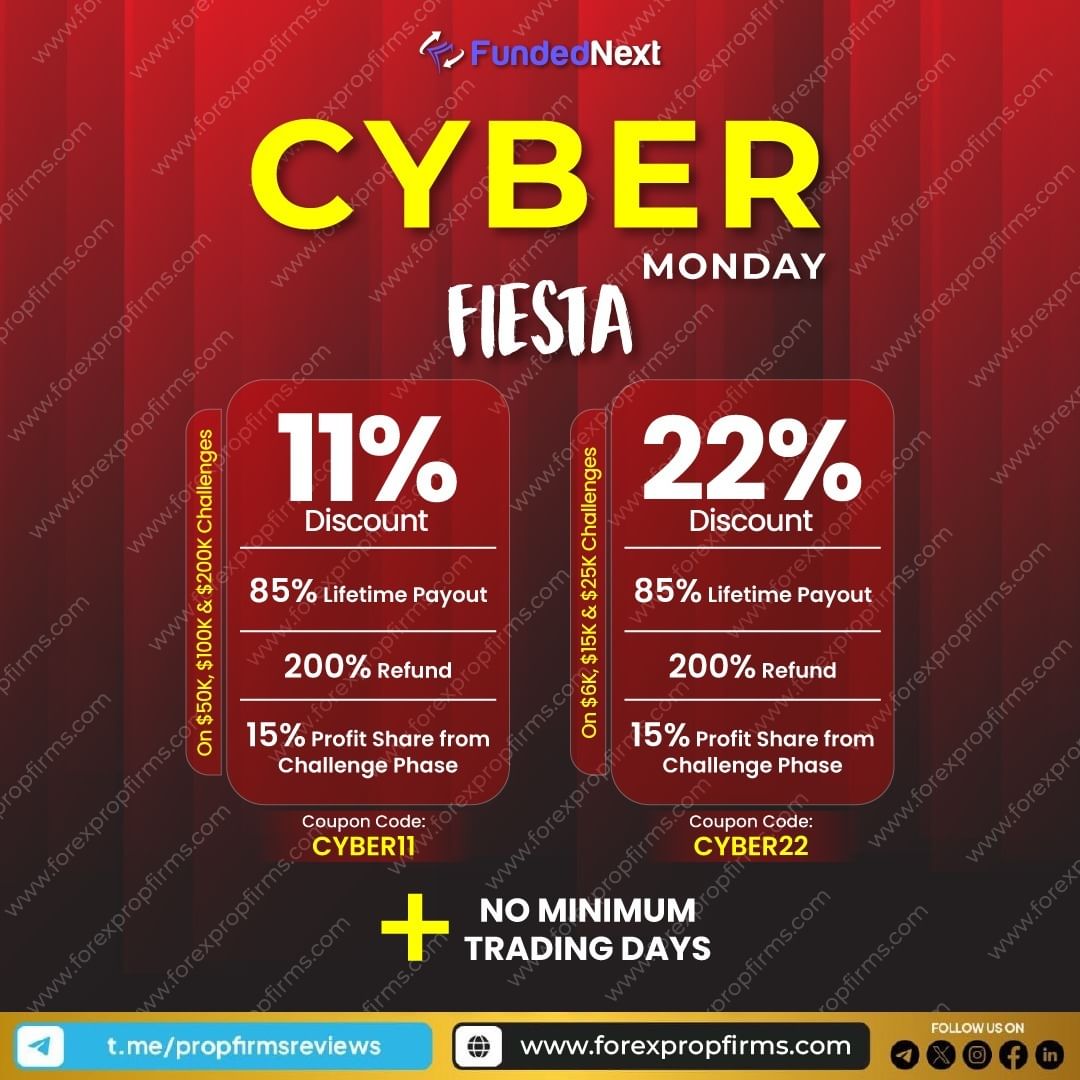 Join the FundedNext Cyber Monday Fiesta and let the allure of flexible trading terms and exclusive discounts pave the way for your financial success. Unleash your investment potential with FundedNext today!