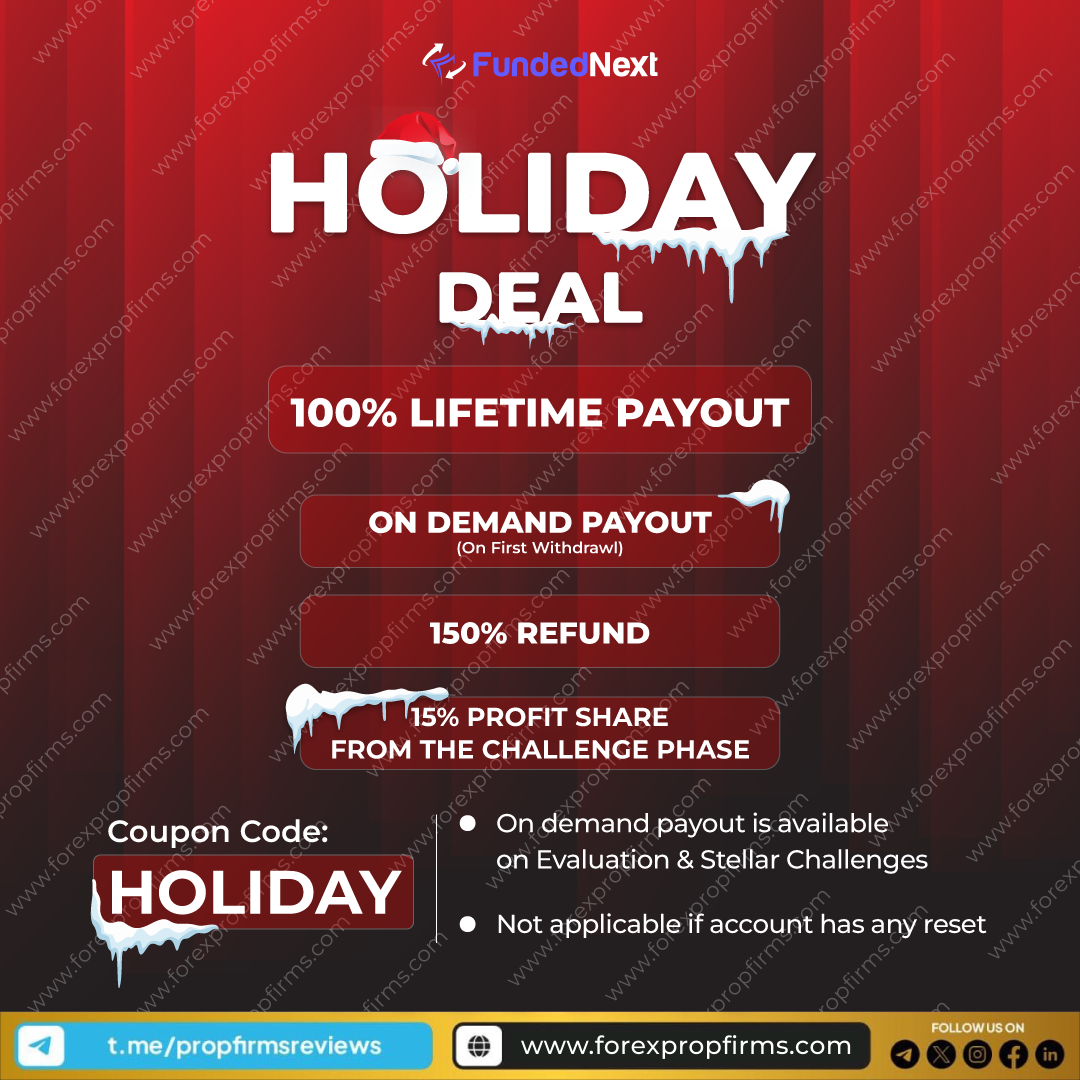 Ring in the holiday season with FundedNext’s irresistible Holiday Deal Alert! Elevate your trading experience with exclusive festive perks, including a remarkable 100% lifetime payout, on-demand payout on the first withdrawal, a generous 150% refund, and a 15% profit share from the Challenge Phase.