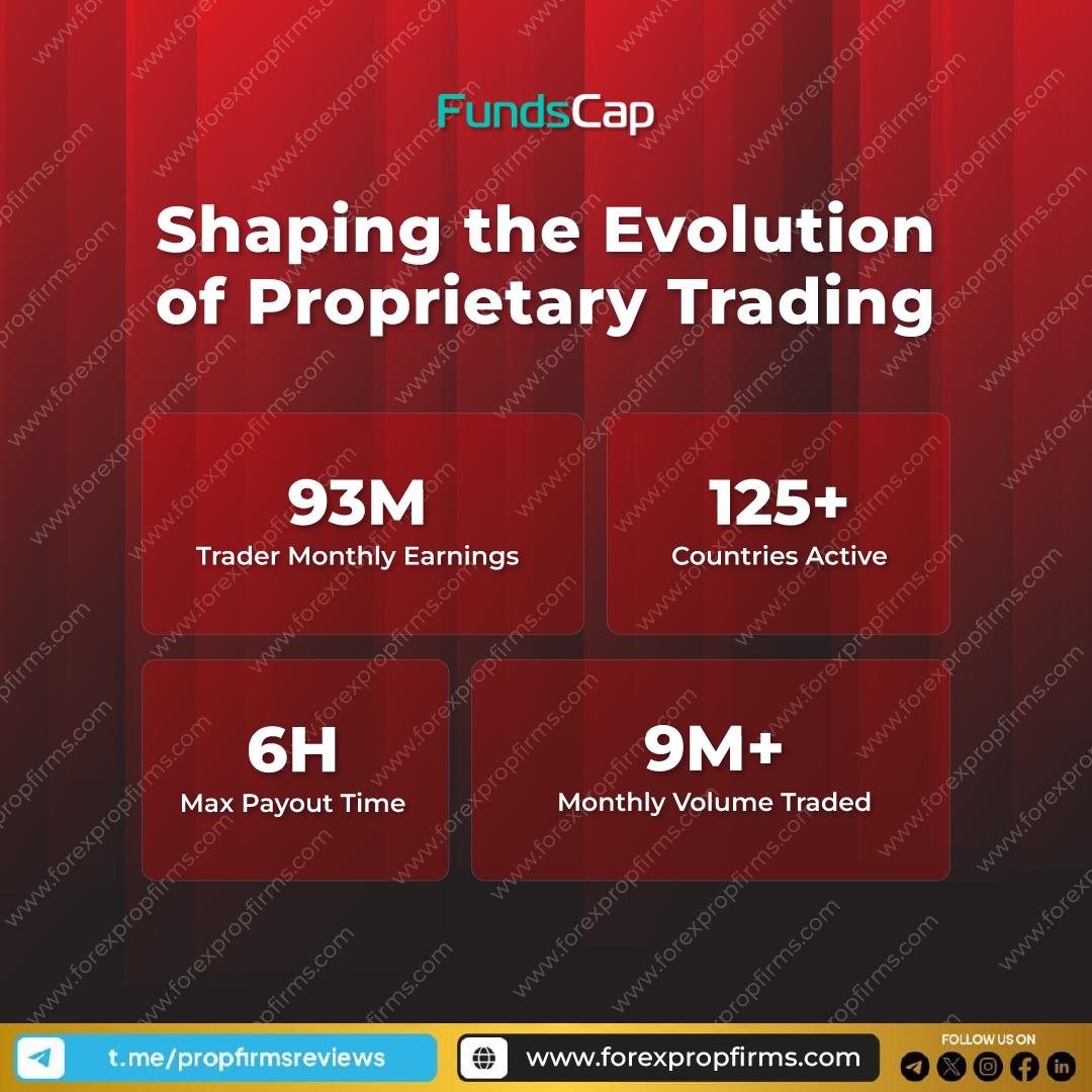 Dive into the cutting-edge realm of proprietary trading with FundsCap, an industry trailblazer shaping the evolution of financial markets. Boasting remarkable statistics, including impressive monthly trader earnings of 93 million, global engagement spanning 125+ countries, a swift maximum payout time of 6 hours, and an outstanding monthly trading volume exceeding 9 million, FundsCap stands tall as a leader in the trading landscape.