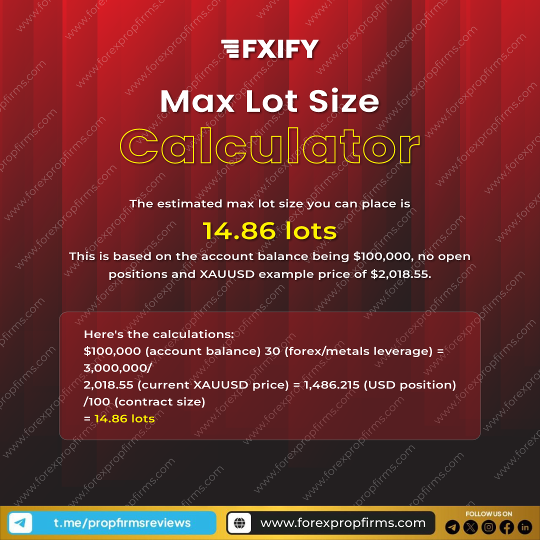 Unlock the potential of your trading journey and trade with confidence, knowing that the FXIFY Max Lot Size Calculator is your trusted ally in navigating the dynamic financial markets. Whether youβre a seasoned trader or just starting, this tool provides a valuable resource to enhance your risk management and elevate your overall trading experience. Take the next step toward precision in trading β explore the FXIFY Max Lot Size Calculator and optimize your path to financial success!