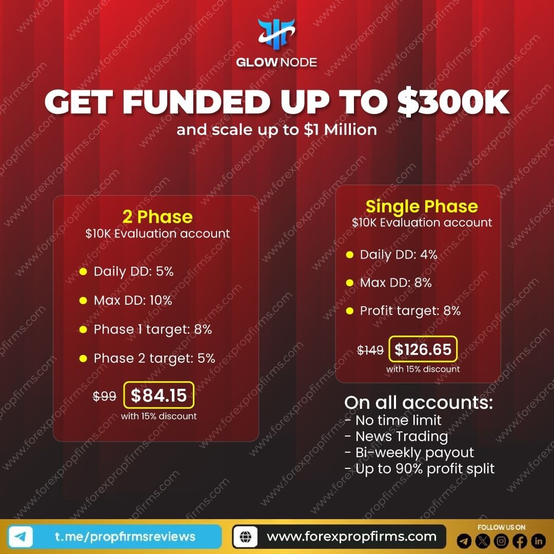 GLOW NODE offers a unique and promising opportunity for traders seeking to expand their horizons and elevate their trading strategies. Their program promises a path to substantial growth and financial scaling, providing a potential funding of up to $300,000, enabling traders to aim for a substantial scale of $1 million.