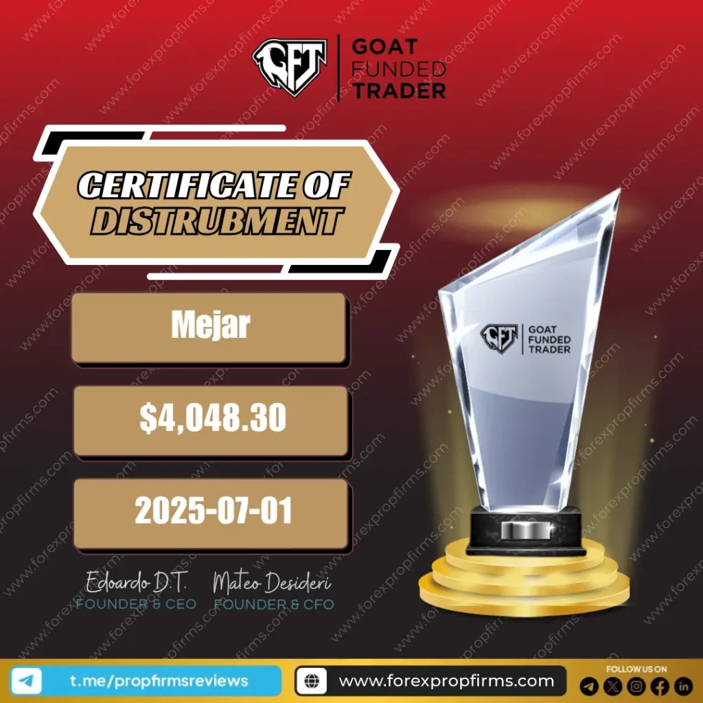 Transparency is everything in prop trading—and Goat Funded Trader just proved again why it’s a trusted name in the industry. On July 1st, 2025, the platform officially issued a Goat Funded Trader payout certificate to trader Mejar, confirming a successful withdrawal of $4,048.30. This kind of documented proof goes a long way in building confidence, especially for those new to the funding scene.