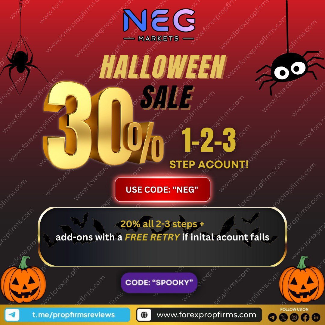 NEG Markets has launched a special Halloween sale, offering traders an opportunity to unlock significant savings on their trading accounts. With the discount code “NEG,” traders can enjoy 30% off 1-2-3 step accounts, providing a cost-effective way to enter the world of live trading. Additionally, there’s an exclusive 20% discount on 2-3 step accounts and add-ons, available with the code “SPOOKY.” This offer also includes a free retry, ensuring that if the initial account fails, traders can try again without any added cost.