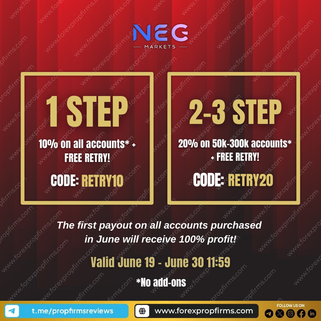 NEG Markets has announced special promotions for traders, offering attractive discounts and benefits. For those participating in the 1 Step Challenge, there is a 10% discount on all accounts and a free retry option, available with the code RETRY10. For the more complex 2-3 Step Challenges, traders can enjoy a 20% discount on accounts ranging from $50,000 to $300,000, also with a free retry, using the code RETRY20.