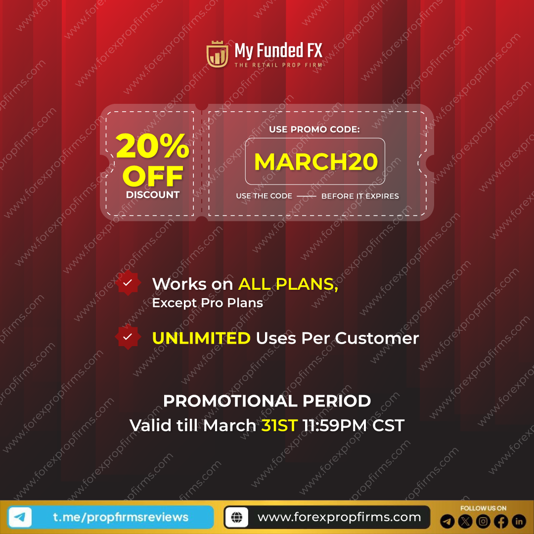 Don’t let this opportunity pass you by – seize the chance to optimize your trading endeavors with My Funded FX‘s exclusive March offer. Harness the power of the Promo Code “MARCH20” and take significant strides toward achieving your trading goals. Elevate your March to success!