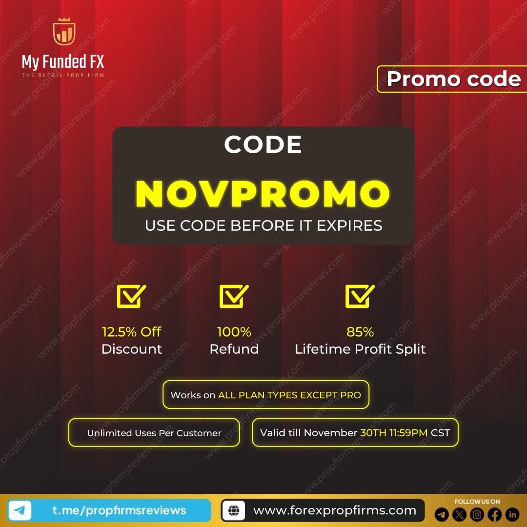 Experience the unparalleled advantages with My Funded FX’s Exclusive Offer! Unveil the potential of the promotional code “NOVPROMO” and immerse yourself in an array of unbeatable benefits. This limited-time offer opens doors to a 12.5% discount, a unique opportunity for a 100% refund, and an exceptional 85% lifetime profit split. The exclusivity of this offer extends across all plan types, encompassing both Expert and Pro plans. The most intriguing facet is the absence of any usage limit, enabling you to leverage this offer multiple times.