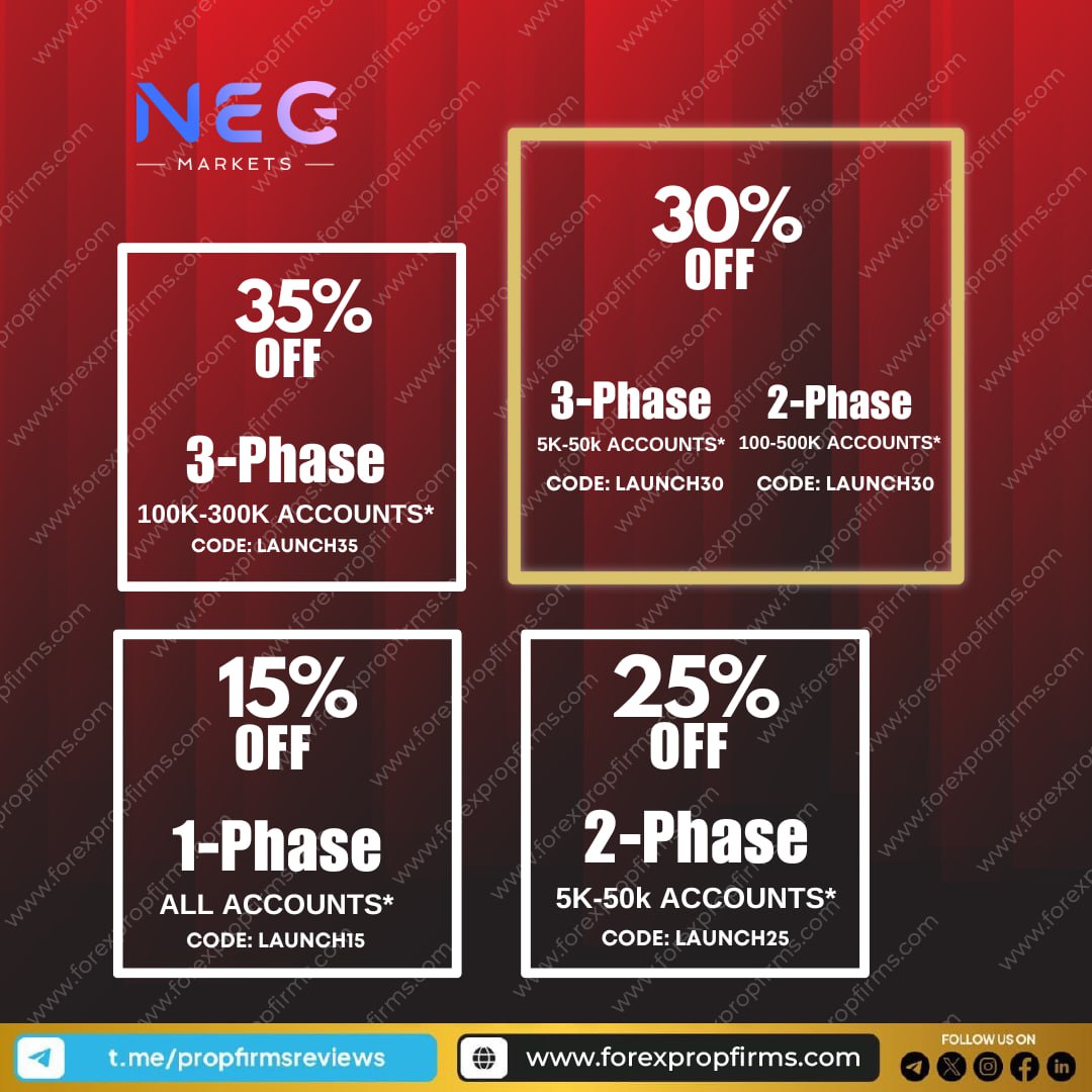 NEG Markets is thrilled to announce an exciting range of discounts available this June. Traders can take advantage of up to 35% off on various account phases with exclusive discount codes: