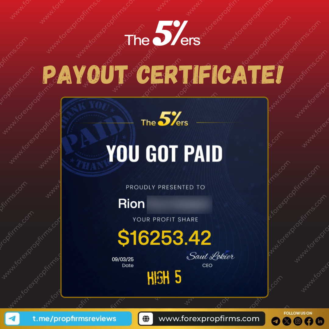 The 5%ers have awarded a Payout Certificate to Rion from Indonesia for successfully earning a $16,253.42 payout. This achievement showcases the opportunities available to skilled traders who demonstrate consistency and discipline in a funded trading environment.