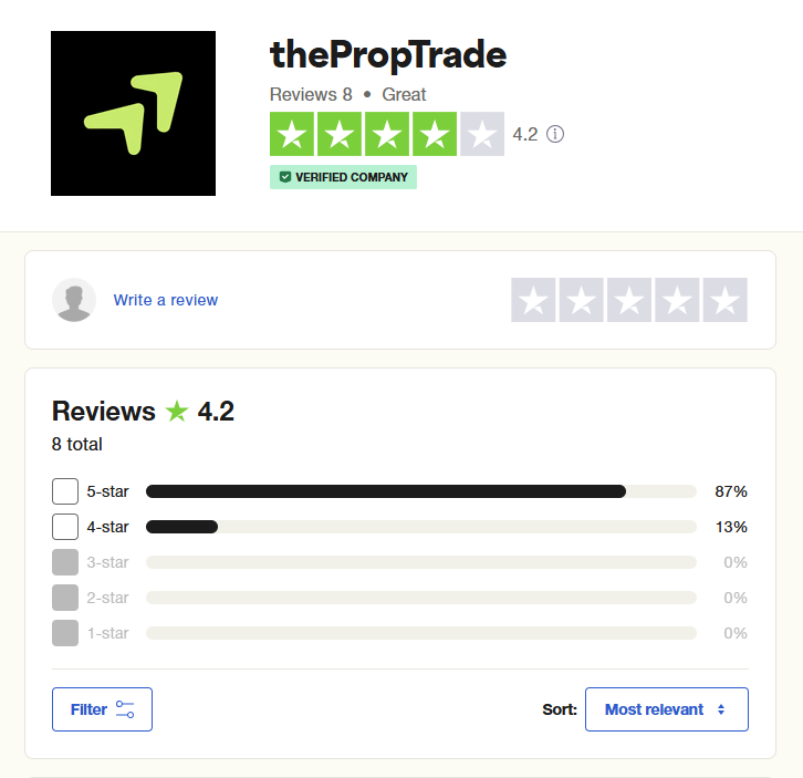 thePropTrade holds a Trustpilot rating of 4.3 out of 5 stars, based on 20 reviews, classifying it as Excellent. Many users praise the platform for its transparency, user-friendly experience, and efficient customer support. A strong proportion of 5-star ratings indicates general satisfaction, while only a small fraction of users expressed concerns.