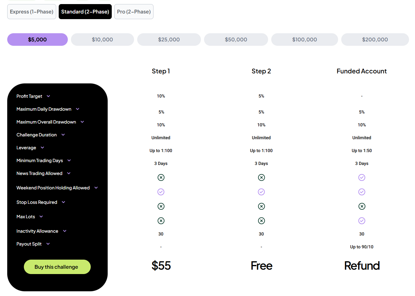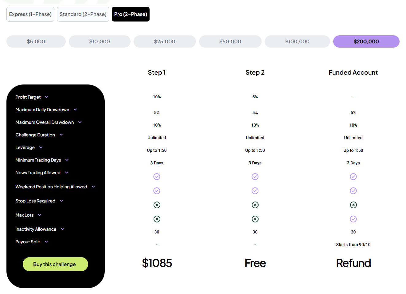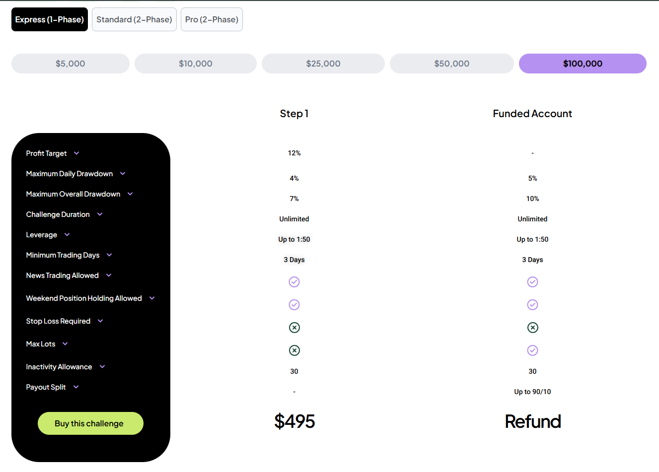 Traders must pass either a one-phase (Express) or two-phase (Standard/Pro) challenge to receive funding.