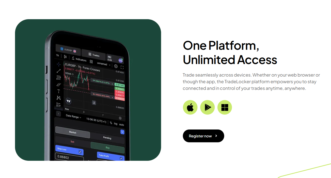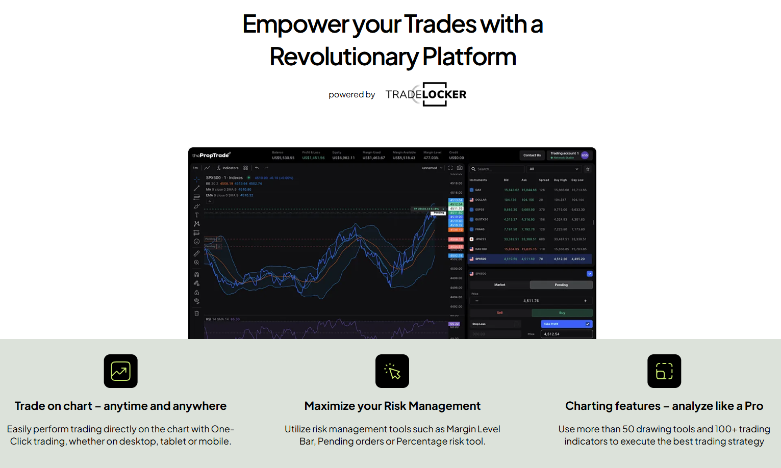 thePropTrade’s trading platform is TradeLocker, a web-based interface available on desktop, tablet, and mobile devices. It integrates powerful risk-management tools such as a margin level bar, pending orders, and a percentage risk tool.