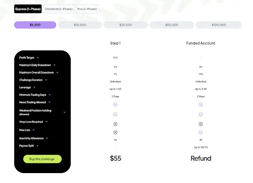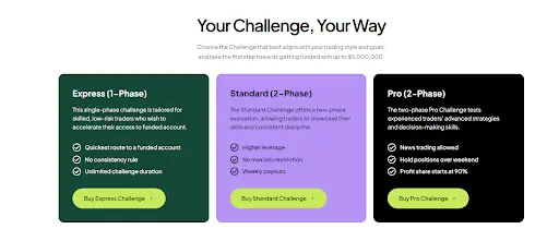 Traders must pass either a one-phase (Express) or two-phase (Standard/Pro) challenge to receive funding.