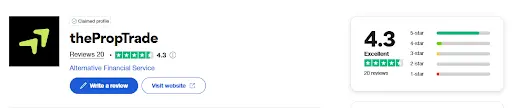 thePropTrade holds a Trustpilot rating of 4.3 out of 5 stars, based on 20 reviews, classifying it as Excellent. Many users praise the platform for its transparency, user-friendly experience, and efficient customer support. A strong proportion of 5-star ratings indicates general satisfaction, while only a small fraction of users expressed concerns.