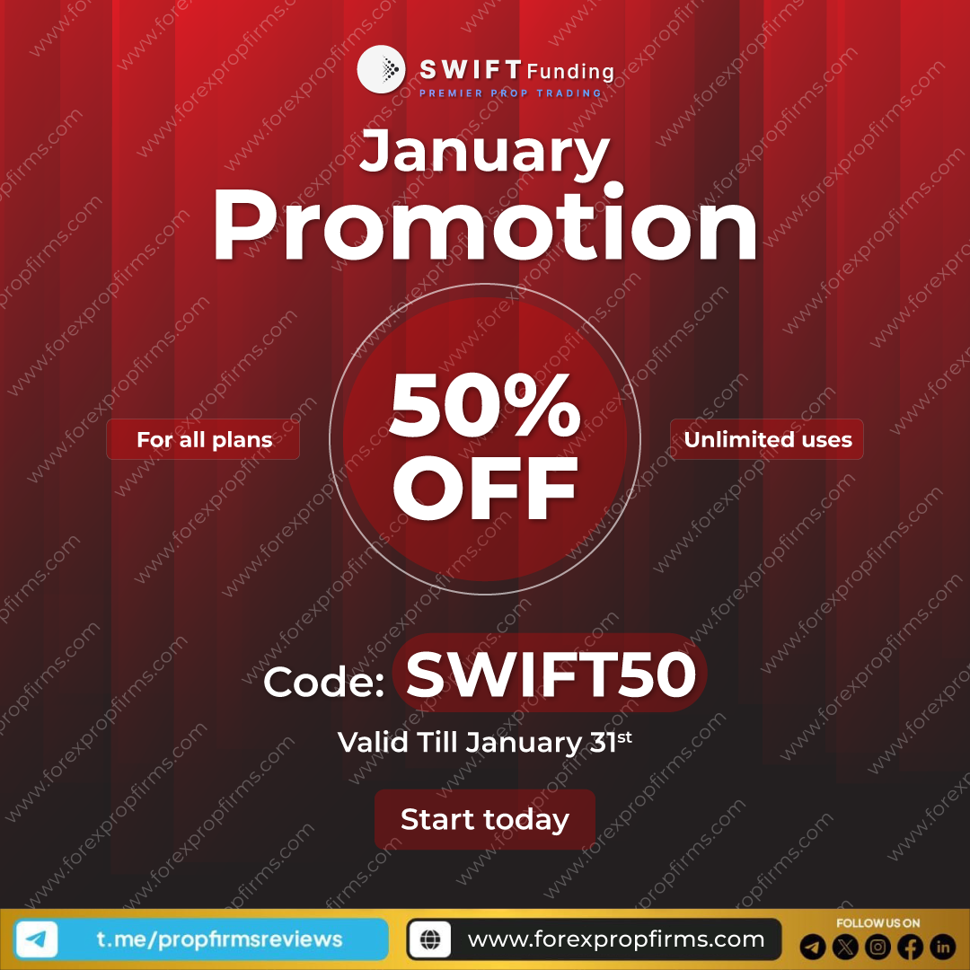 A resounding opportunity echoes in the trading realm as Swift Funding unveils its January Promotion Alert! Dive into your trading journey with vigor, courtesy of an exclusive 50% OFF on all Swift Funding plans. This limited-time offer, available for unlimited use until January 31st, is a strategic invitation to elevate your trading prowess.