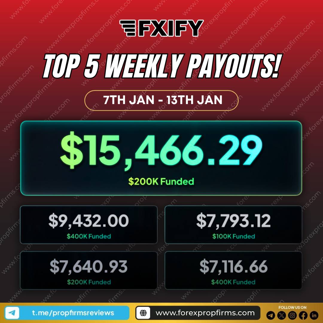FXIFY has released its top five trader payouts for the week of January 7th to January 13th, showcasing the impressive earning potential of funded accounts. The list is led by a remarkable $15,466.29 earned by a trader with a $200K funded account. Other notable payouts include $9,432.00 from a $400K account, $7,793.12 from a $100K account, $7,640.93 from another $200K account, and $7,116.66 from a $400K account.