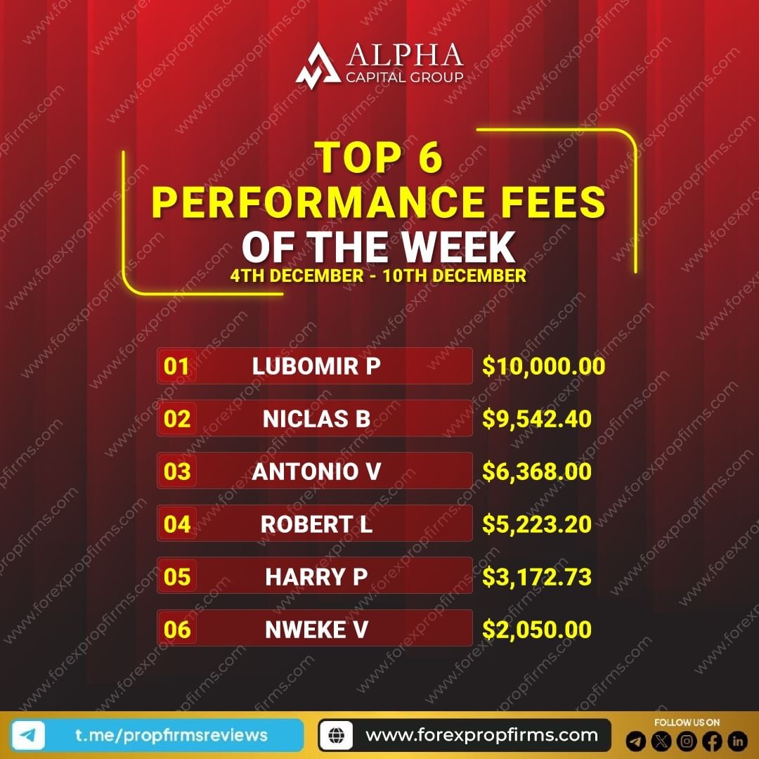 Lubomir P leads the charts with an outstanding performance resulting in a remarkable performance fee of $10,000. Following closely behind, Niclas B secured an impressive $9,542.40, showcasing a remarkable skill set in trading. The notable achievements continue with Antonio V, securing $6,368.00, and Robert L, earning $5,223.20, further reinforcing the depth of talent within Alpha Capital Group.
